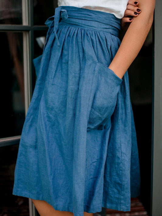 Petrolblauer Leinen-Midirock mit Rüschen und Bindegürtel