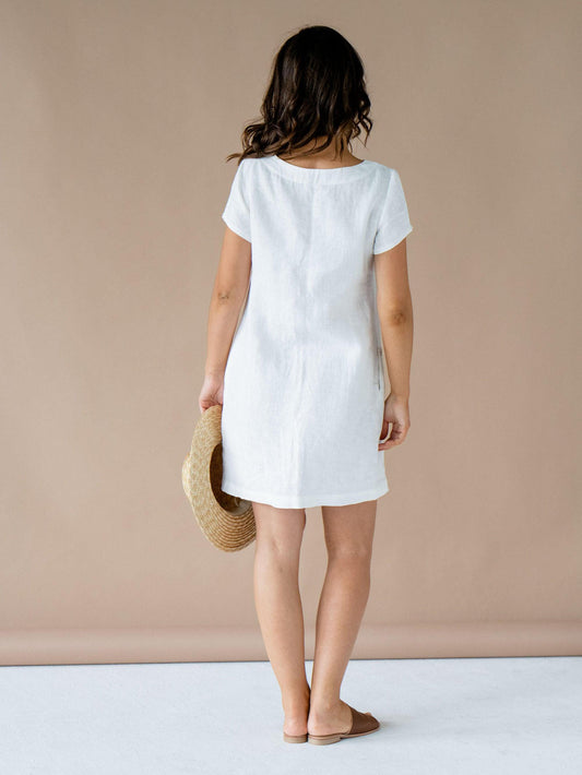 Balta lininė midi marškinėlių suknelė pūstomis rankovėmis